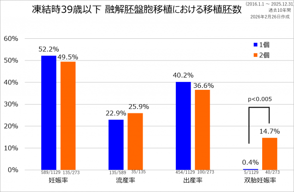 当院における過去10年間の融解胚盤胞移植の移植胚数別の成績です。胎嚢の確認をもって妊娠としています。