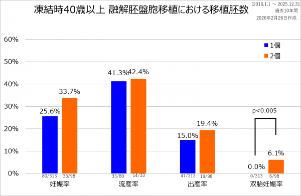 移植胚数別にみると、39歳以下では差は認められず、40歳以上では2個移植の成績が高い傾向が見られました。また、2個移植における双胎妊娠率は1個移植に比べ有意に高い値となりました。