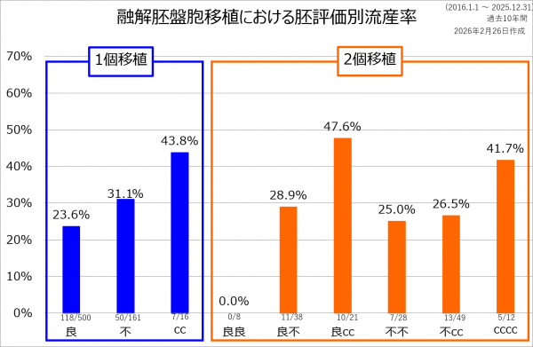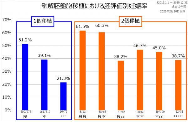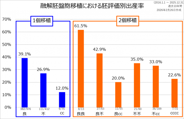 表では、胚の評価の組み合わせ別に1個移植と2個移植の成績を比較しています。
